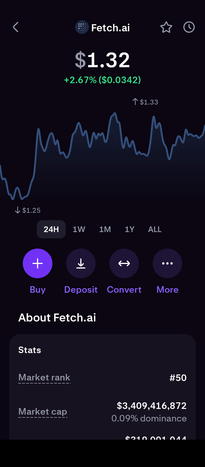 4. Select the Buy option: After you complete the previous step, you will navigate to the FET token profile page on Kraken. Here, you will see a price, the price performance, and a chart with different time intervals. Below that, you will see different actions you can take (e.g., Buy, Deposit, Convert, and More). Select the Buy option.