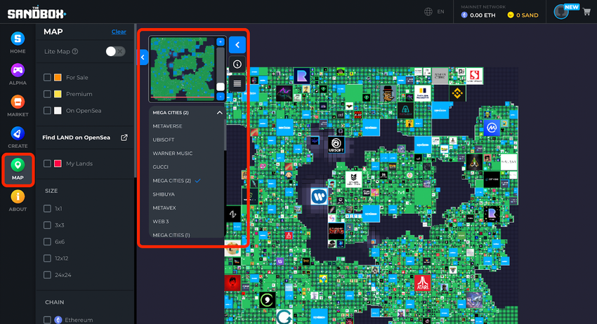 If you’re looking to buy metaverse land, you should check out the Map tab. Here you will see the entire map of The Sandbox. You can use the filters to discover any specific virtual properties.