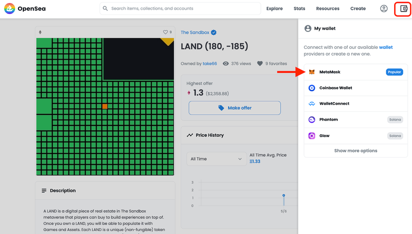 However, when you click on any of the land listings, it will open an OpenSea page. We will use MetaMask wallet to connect to OpenSea. Click on the wallet icon to connect your crypto wallet to OpenSea. You will also have to confirm the connection from your wallet.