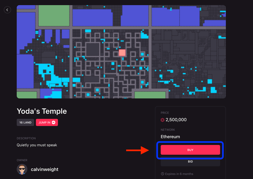 To buy land on The Sandbox, you have to select the land you want to purchase. You have the option to buy it on the spot and pay the listing price. Or you can make an offer if you want to offer less for it.