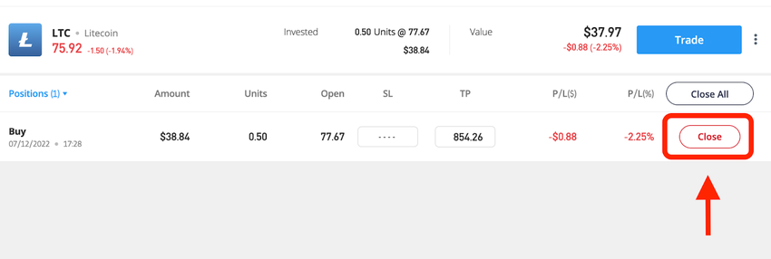 If you have multiple open positions and want to see more options for the Litecoin trade, click on the asset’s name. You will now see the trade window for that specific asset.