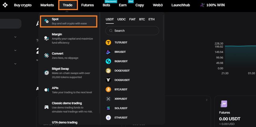 ➤ Go to “Trade,” then ‘Spot.” This is where you can buy and sell tokens on the spot market.