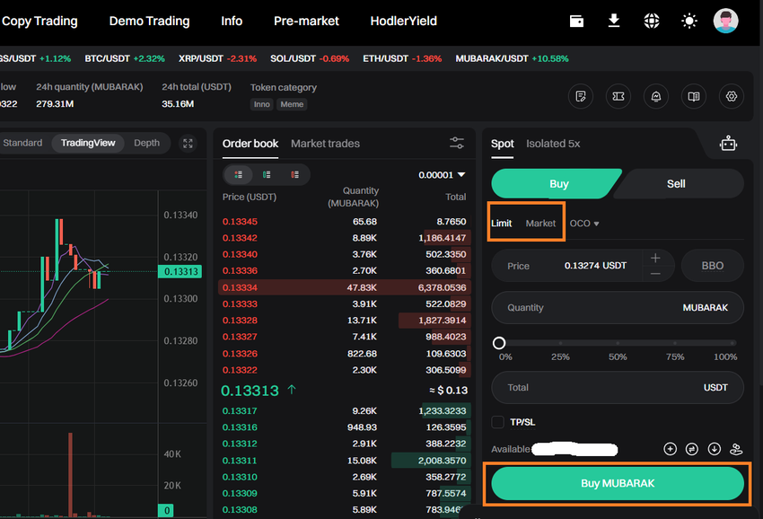 - Search for MUBARAK and choose a trading pair (e.g., MUBARAK/USDT).