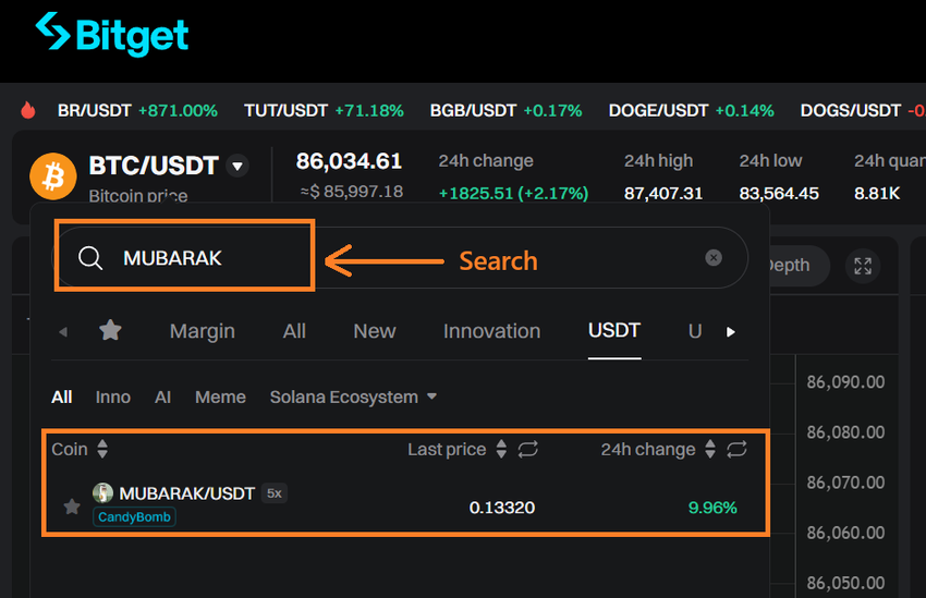 ➤ Search for MUBARAK — type “MUBARAK” or its trading pair (e.g., MUBARAK/USDT) in the search bar as shown below.