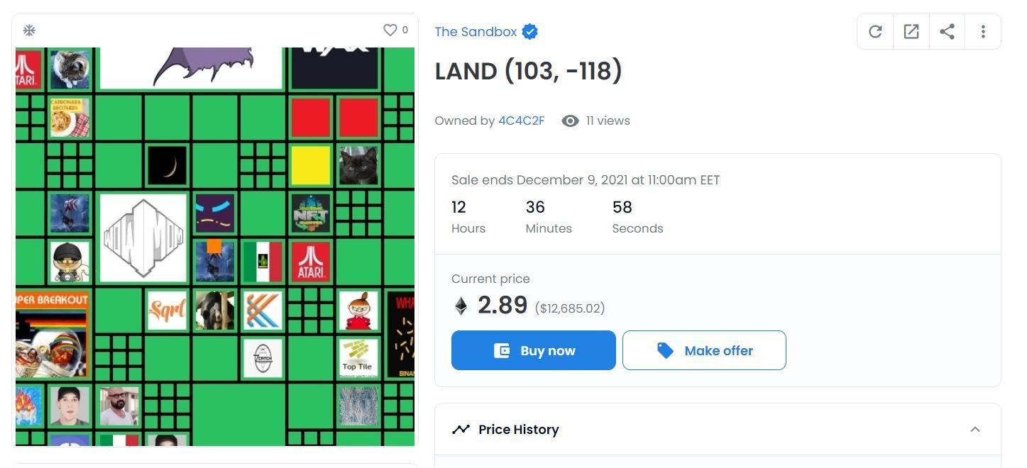 Let’s take, for instance, one random NFT from The SANDBOX collection that belongs to a virtual metaverse. As for any NFT, you will see the type of listing (timed auction or fixed price), the minimum price, and all the other details about the NFT.
