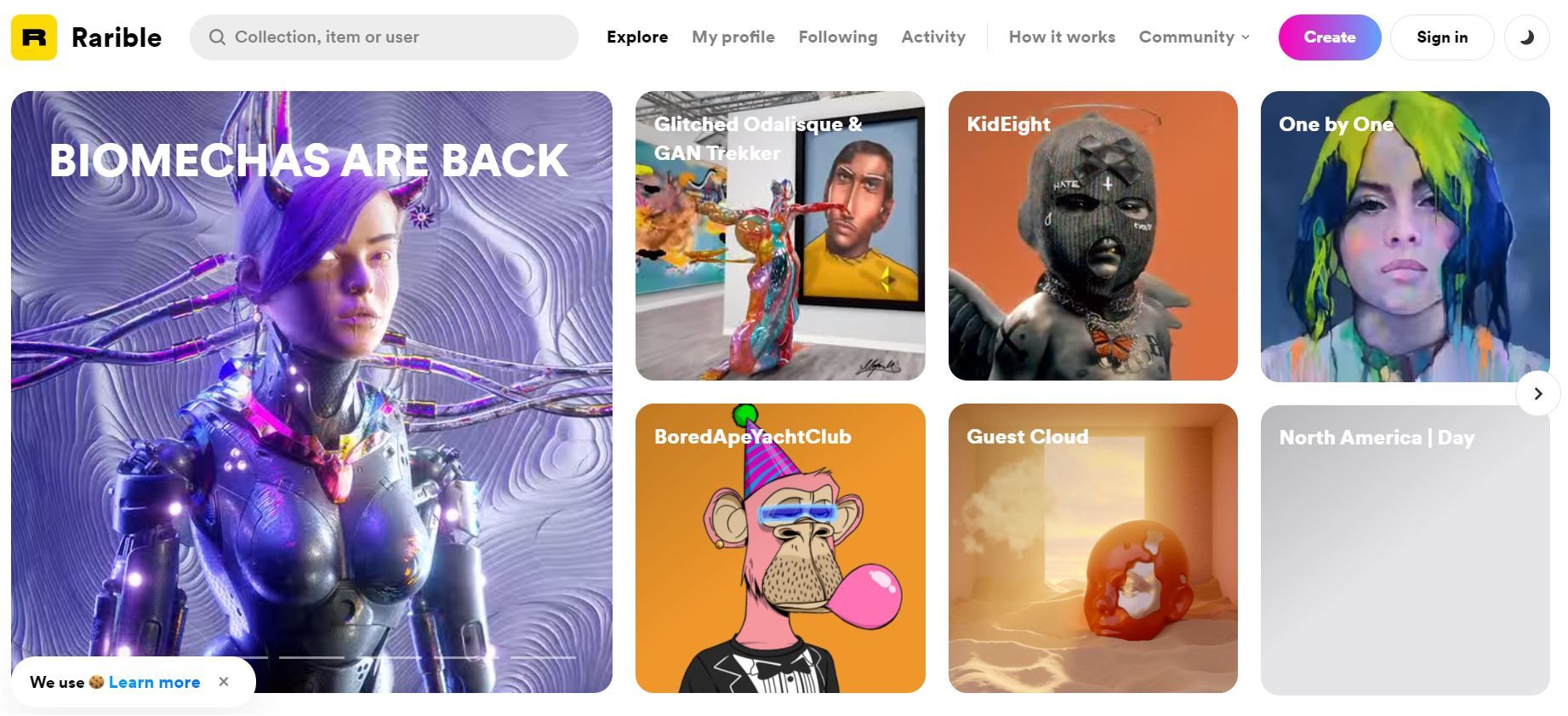 On Rarible, NFT collections are categories such as Art, Photography, Games, Metaverses, Music, Domains, DeFi, Memes, Punks, and NSFW.