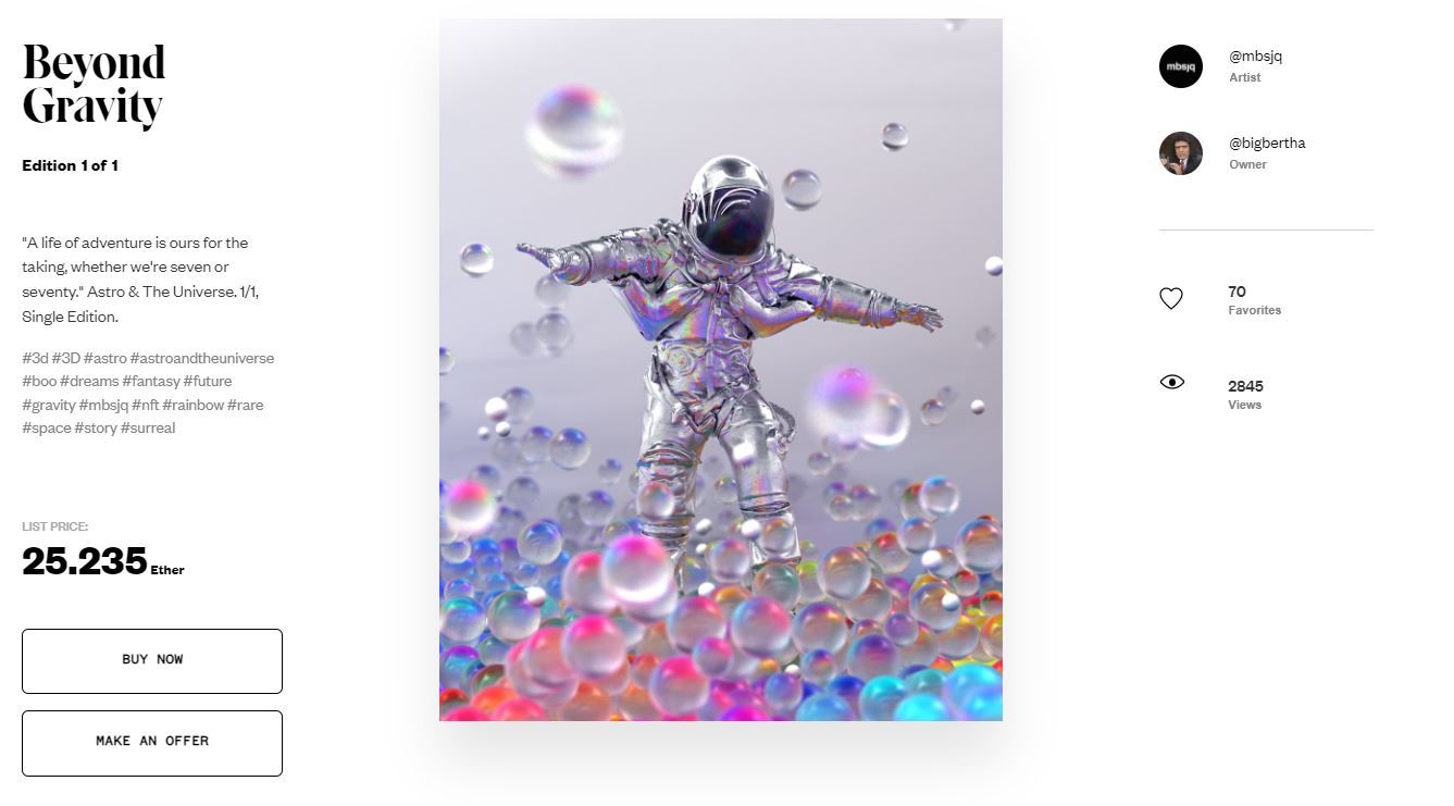 After selecting an NFT of your choice, click on it to see the NFT’s page and all the details, such as the artist who created it, the current owner, details about the artwork, and the selling price.
