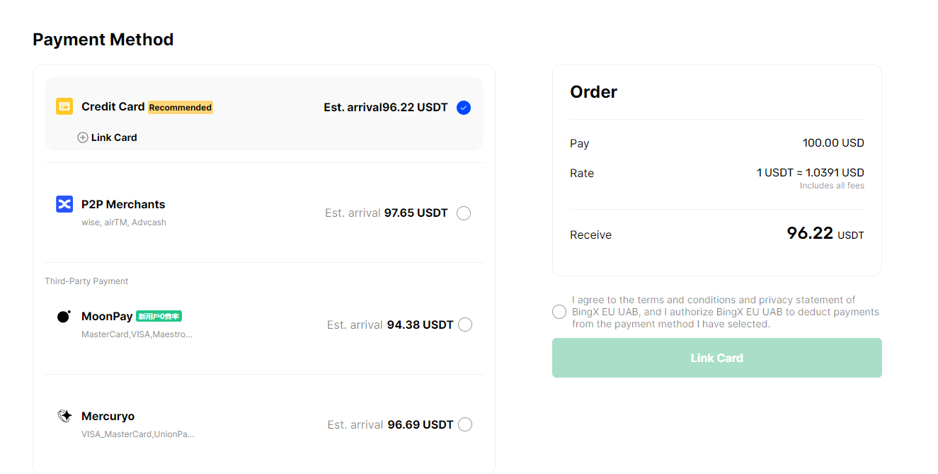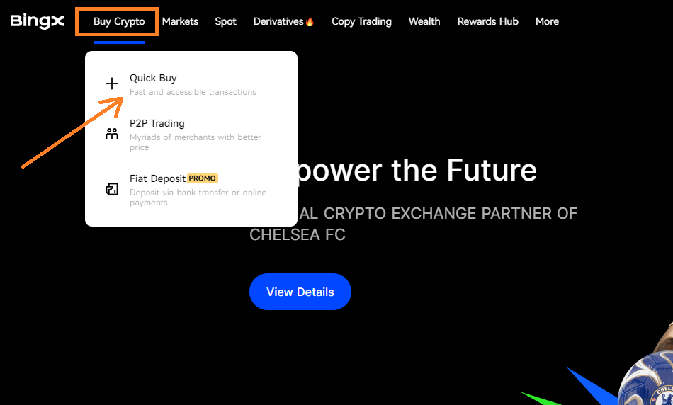 Now, you can deposit USDT from an external wallet or buy some on BingX. Buying on BingX is simple — you get two choices: Quick Buy and P2P trading. As the name suggests, Quick Buy is the easier option between the two, especially if you are a new user.