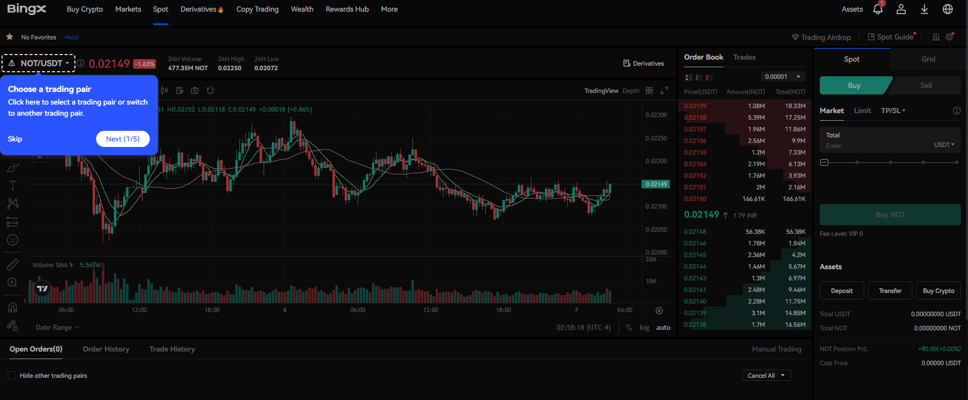 BingX listed Notcoin on June 6, 2024, and so far only one trading pair involving NOT is available — NOT/USDT. So the easiest way to go about buying Notcoin would be to have some USDT balance in your BingX portfolio and trade it to buy NOT.