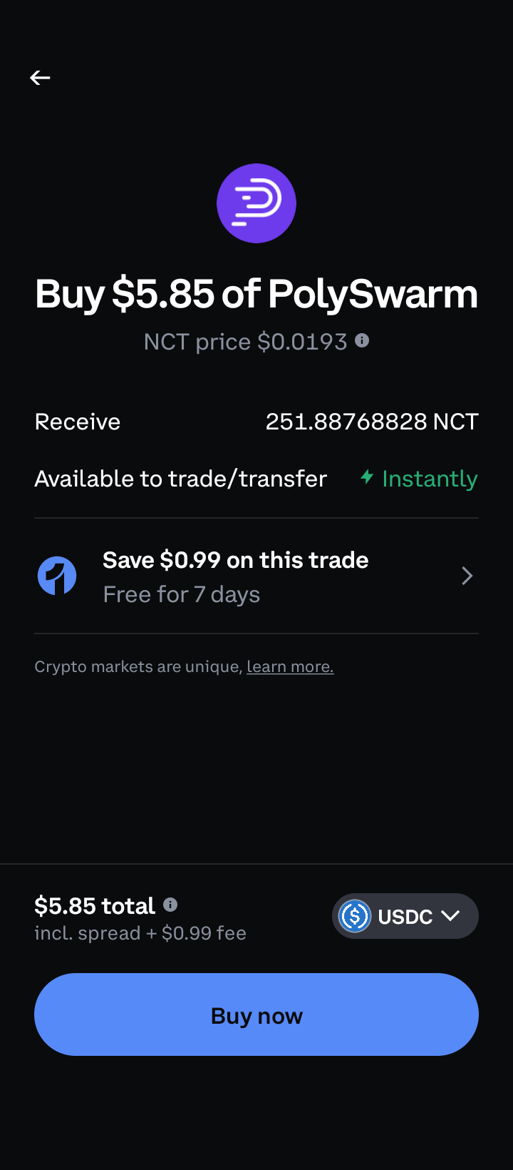 5. Confirm your order: Review the details of your order. Once you verify that the information is correct, press Buy now to submit your order to buy NCT crypto.