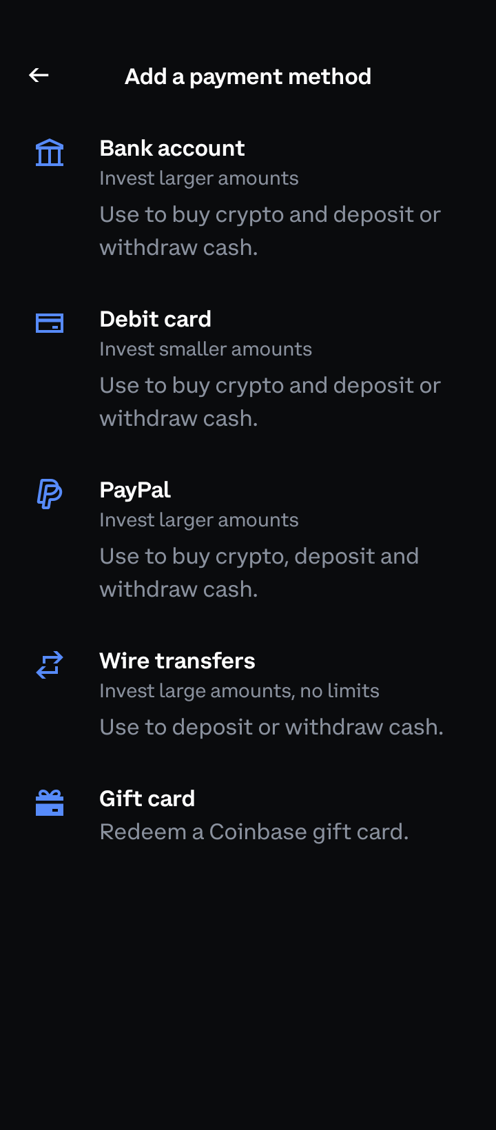 Coinbase also accepts payments via third-party payment processors like PayPal. Other exchanges may accept Apple Pay, Google Pay, and other payment providers.