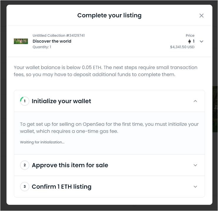 This is what it looks like to complete the listing for your NFT sales. As you can see, the platform will ask for a one-time gas fee to initialize your wallet.