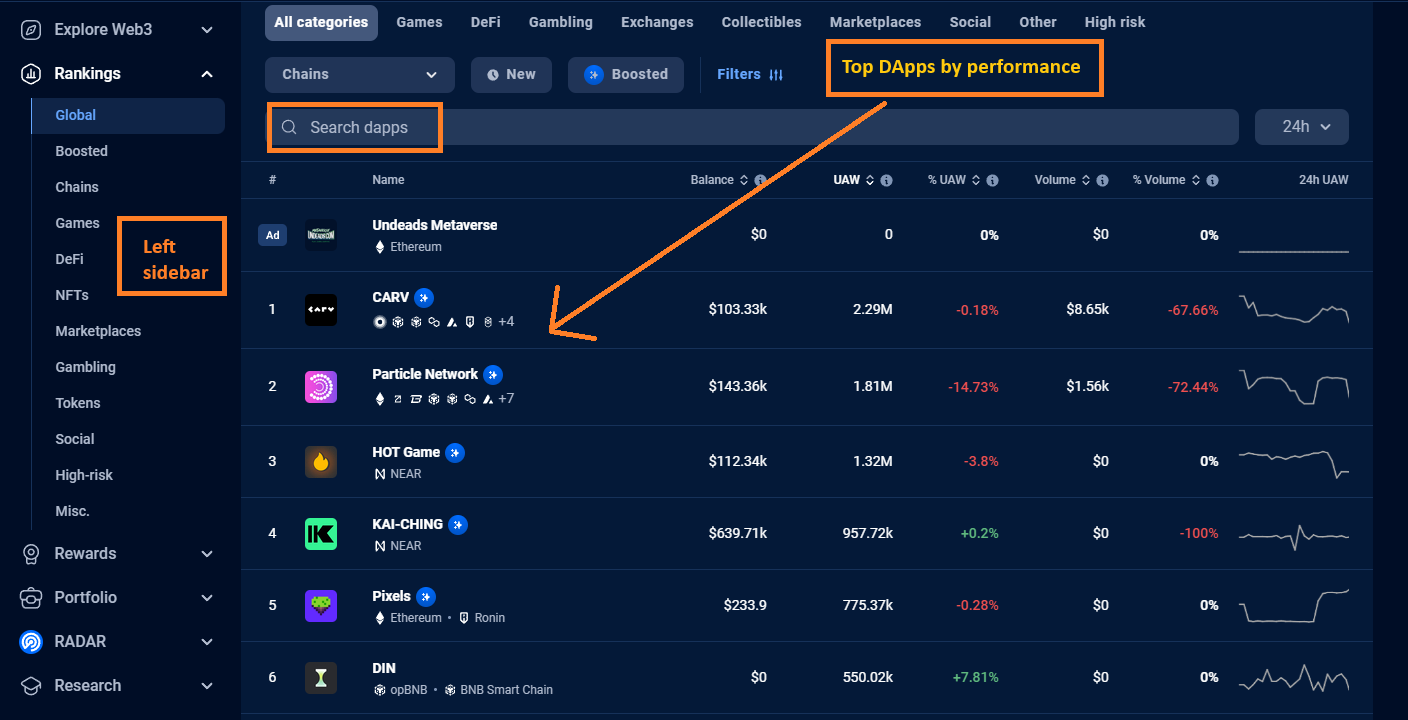 Sponsored SponsoredDappRadar categorizes DApps into various sections such as games, social, high-risk, etc. You can find these categories on the left sidebar. The platform helps you explore different types of DApps based on your interests. For example, you can check out the latest blockchain games, discover new DeFi protocols, or explore unique NFT collections. If you want to browse and explore web3 projects, including DApps, just go to the Explorer option on the left sidebar.