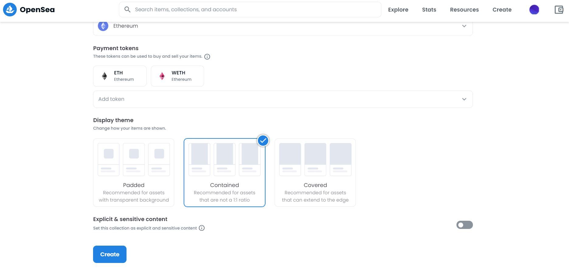After you specify all of these details, you can click on Create to create your NFT collection.