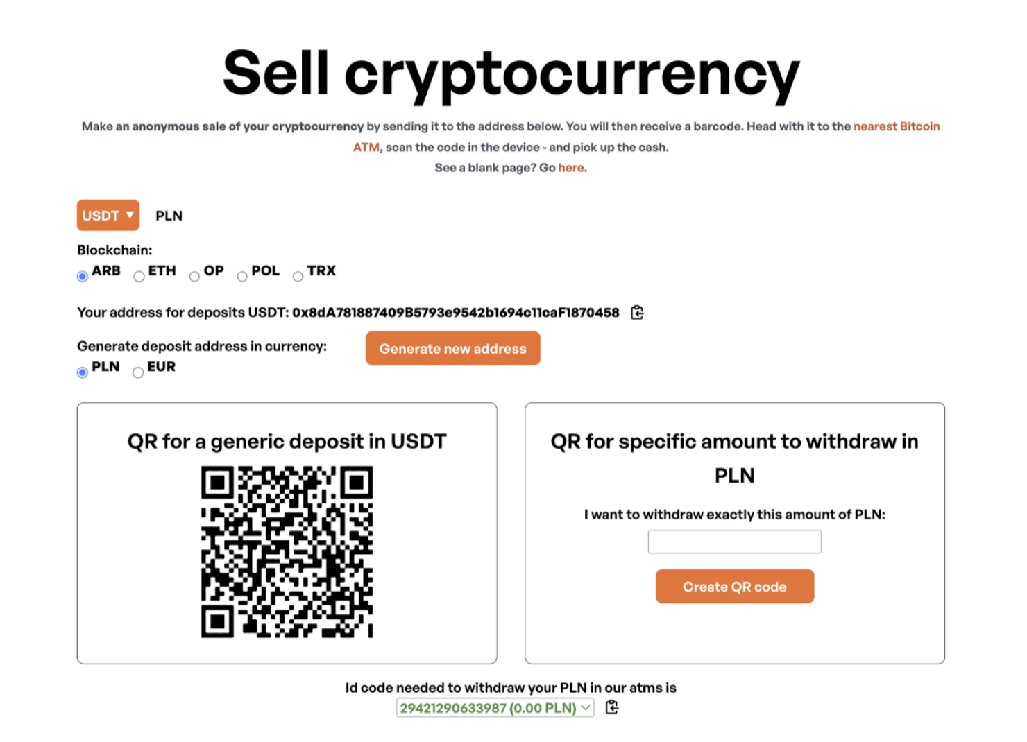 - Scan this QR code using the ATM’s scanner. Depending on the network you choose (Ethereum Mainnet, Optimism, Arbitrum, TRX, or Polygon), the processing time may vary.