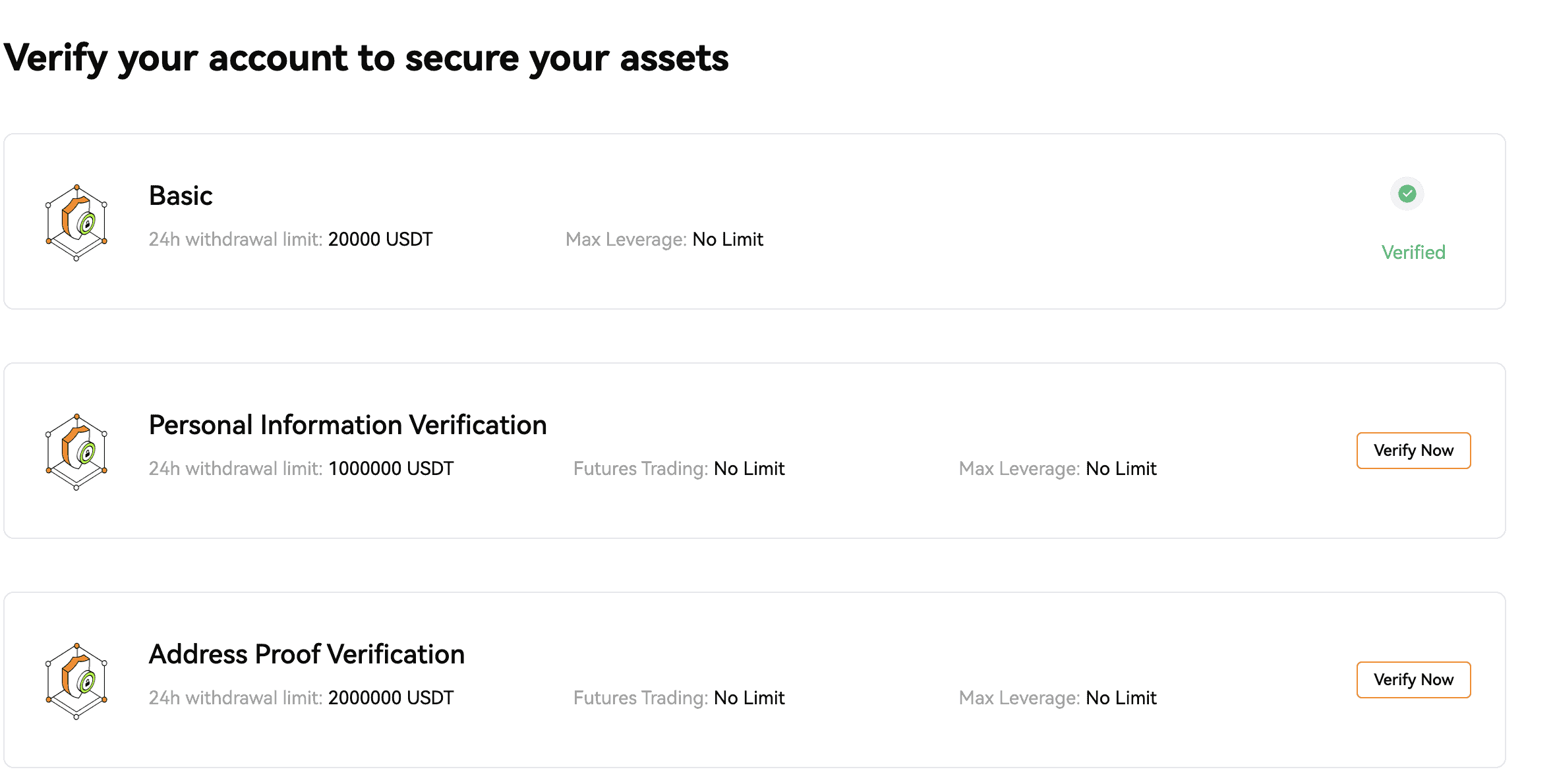 Yet, even non-KYC verified accounts receive decent perks, including a no leverage cap and a 24-hour withdrawal limit of 20,000 USDT.