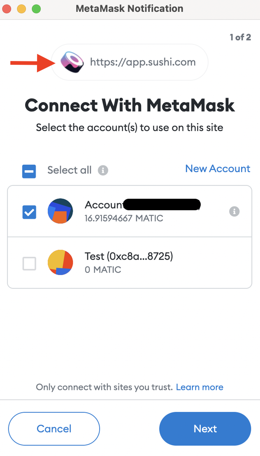 Note that there will be two notifications from MetaMask, and you will have to click Connect on both of them to successfully connect to SushiSwap DEX.