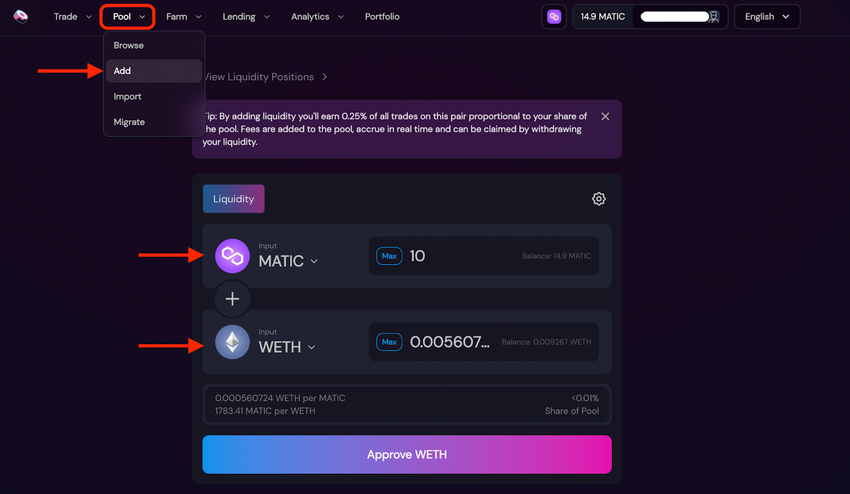 Head over to Pool > Add from the top menu and select the token pair you want to deposit as liquidity. You’ll also need to input the amount for each token, but they will need to be of equal value.