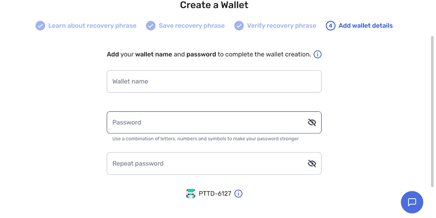 Once you have verified the recovery phrase, you can proceed to the next stage: provide a name for your wallet and establish a password. Enter the same password on the last empty box.