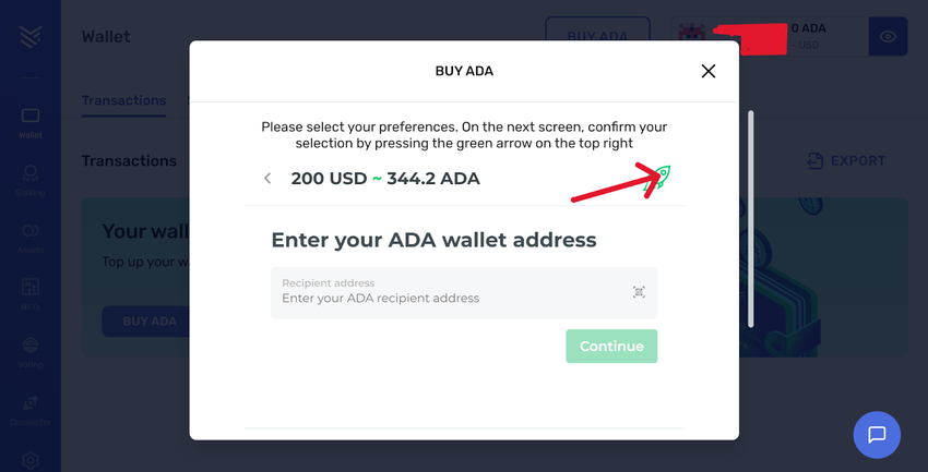 Confirm that you accept the terms, then click “Buy Now.” Allow some time for the transaction to complete, and soon, your ADA will be deposited into your wallet address.