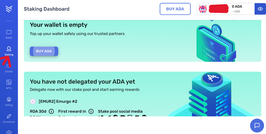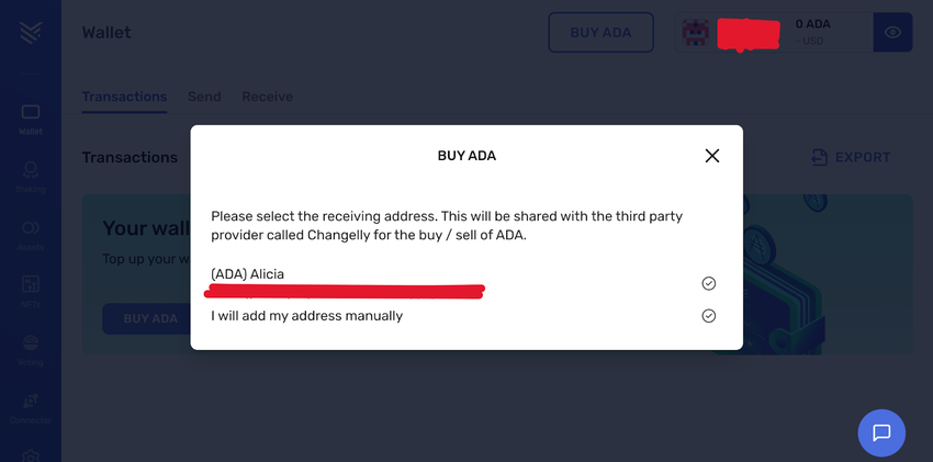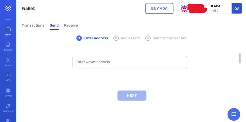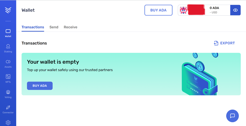 In our case here, it’s still empty. But you’ll click on “Buy ADA” to start the process.