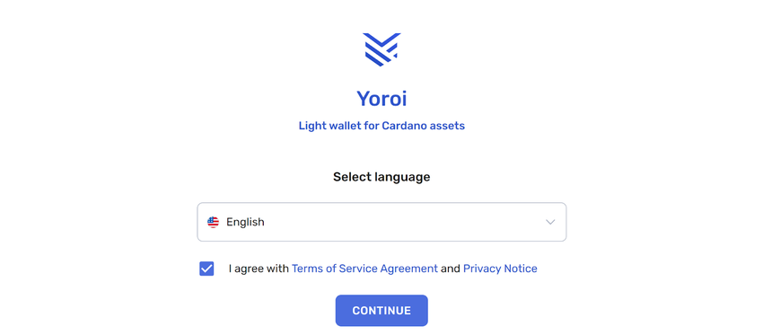 Click on Yoroi to start the wallet setup process. Your screen will transport you to the Yoroi site, where you can pick your preferred language. Take a moment to read and accept Yoroi’s terms and conditions.