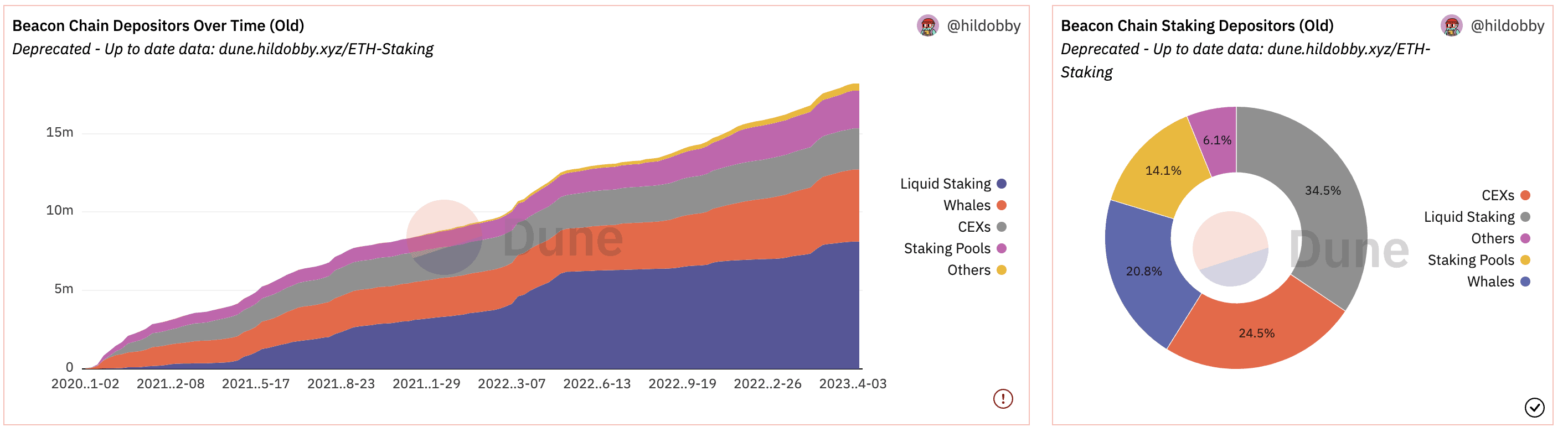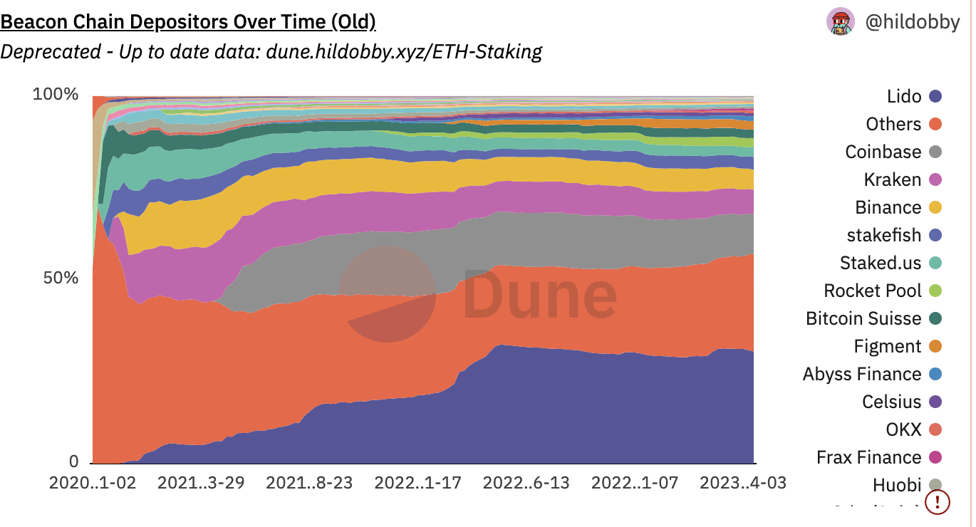 It is evident how significant the share of liquid staking is, especially post the Shanghai upgrade. Do note that the centralized exchanges come after the liquid staking platforms with at least a 10% lesser share. This shows that people are willing to move their staked Ethereum to a liquid staking platform. And Lido seems to be the most obvious choice, with a 30.24% of liquid staking market share.