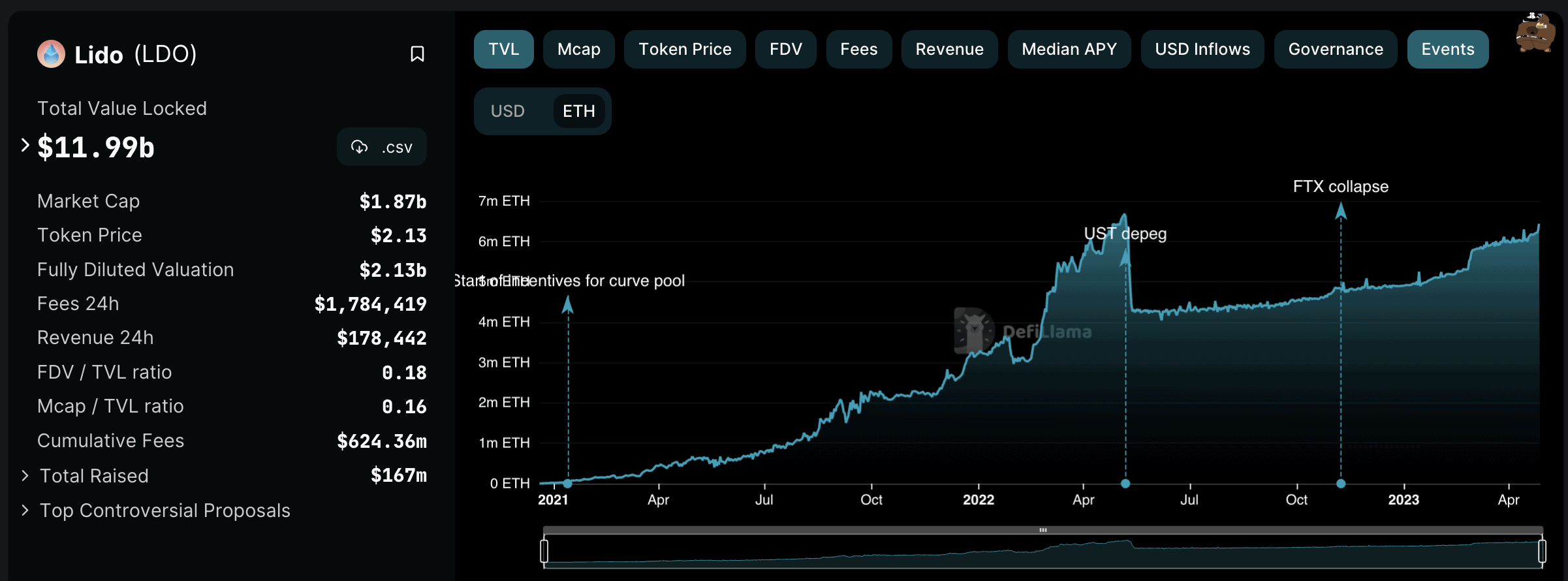 Also, Lido has a 73.92% market share when it comes to the TVL of all the LSD (liquid staking derivative) ETH.