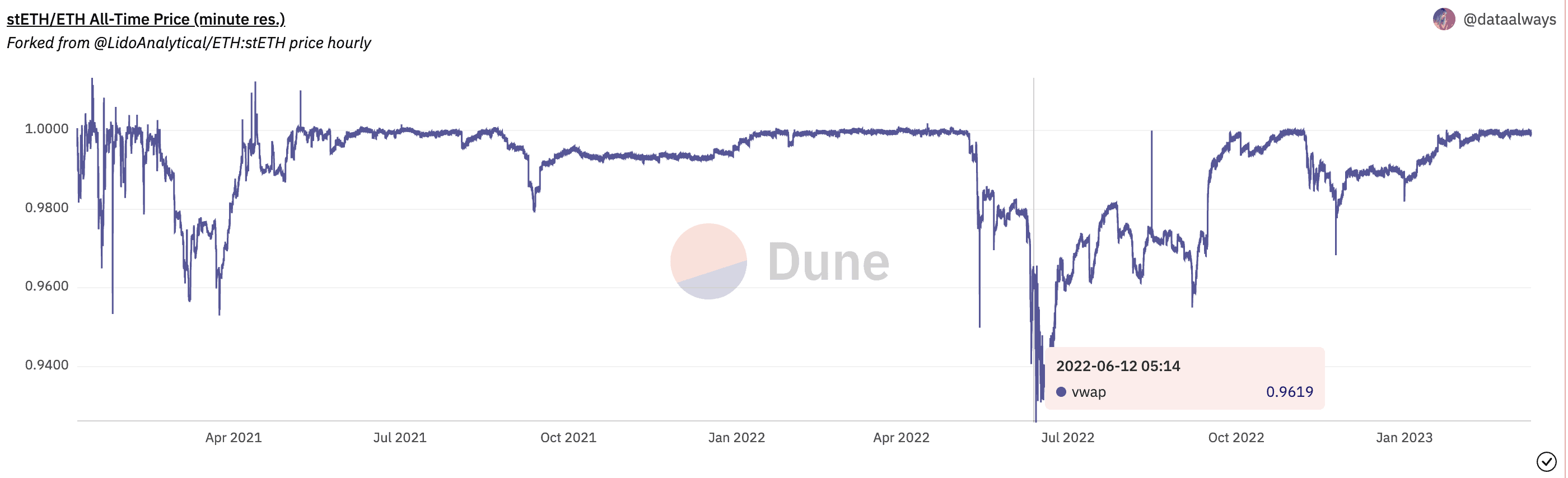 Ideally, one stETH should always be equal to one ETH. Yet, as it is a representation of ETH, it is common for the value to drop momentarily in case of market uncertainty — something that happened during the Terra crash.