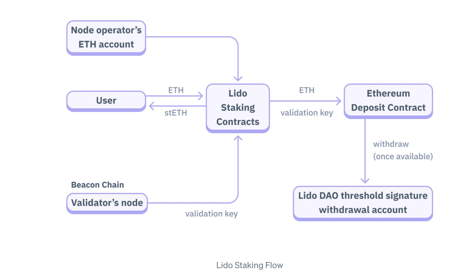 Once a user stakes ETH, Lido’s node operators move the coins to the Beacon Chain of Ethereum 2.0. On the chain are validators who stake the same ETH on behalf of the users. The validators, in turn, earn staking rewards, which are distributed among the ETH stakers per the ratio of their holdings.