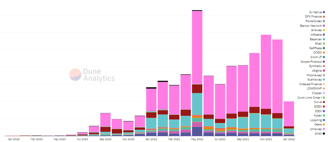 Many popular DEXs run on the Ethereum or the BSC networks, such as Uniswap, Pancakeswap and Sushiwap.
