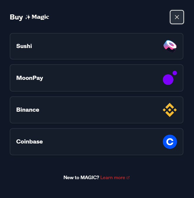 Treasure users can use any of these Ethereum wallets (MetaMask, Rainbow, Coinbase Wallet, and Gnosis Safe) to buy and store MAGIC. Users should ensure they are on the Arbitrum network when buying the MAGIC token. MAGIC powers all the metaverses in the Treasure ecosystem. Therefore, you cannot get started without it.