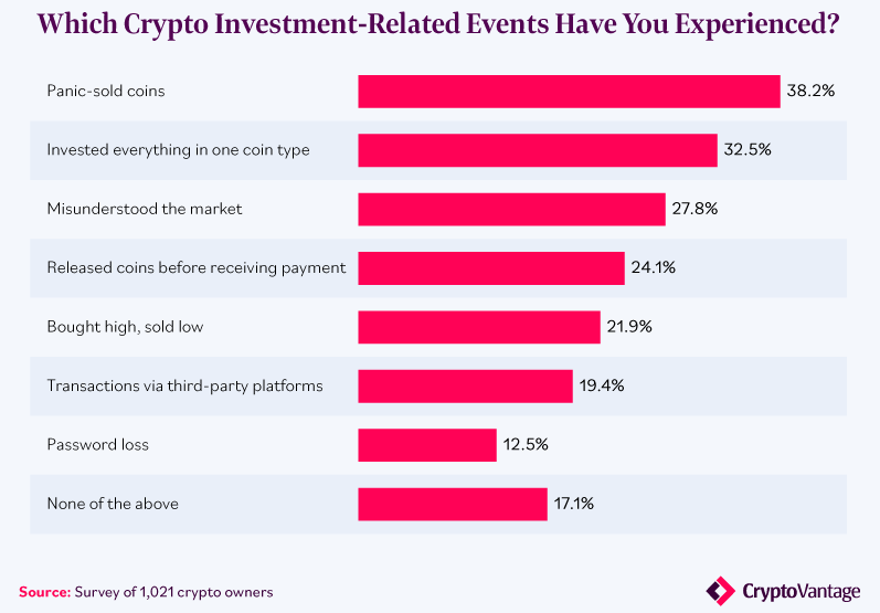 This happened when the price of BTC dropped in 2021, leaving Bitcoin to struggle at a $30k resistance level for over a month. Meanwhile, the cooler heads — the strong hands — were taking advantage of this and kept buying the dip. After all was said and done, crypto traders expressed deep regrets, as shown in a survey conducted by Crypto Vantage.