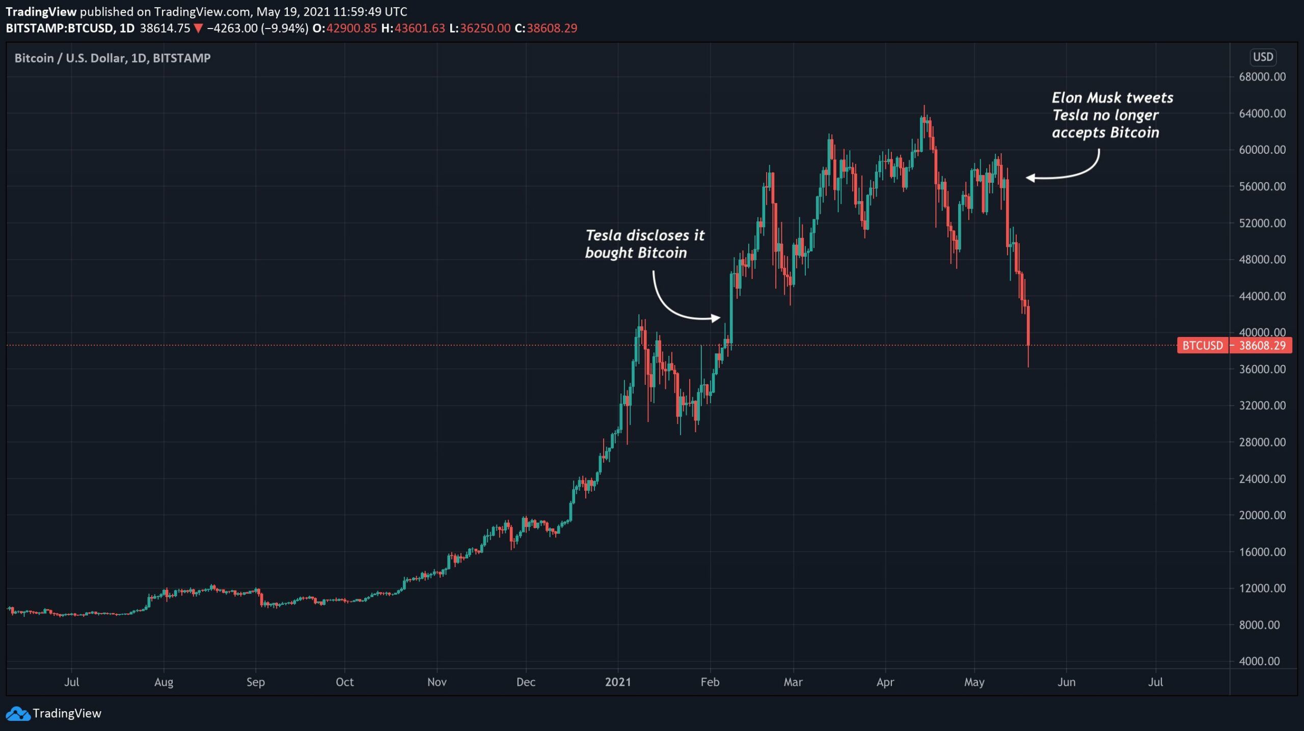 We’ve seen single tweets in the past drastically affect the market. The quick nature of events in the crypto space coincides with the viral nature of social media. Millions of people can sell BTC if someone significantly expresses negative sentiment.