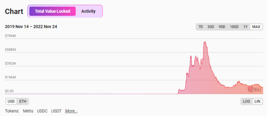 From Nov. 20, 2021, to March 22, 2022, the TVL (total value locked) jumped from just above $800k to an ATH of almost $750 million. However, the protocol native $METIS token accounts for over 50% of the rollup’s TVL.