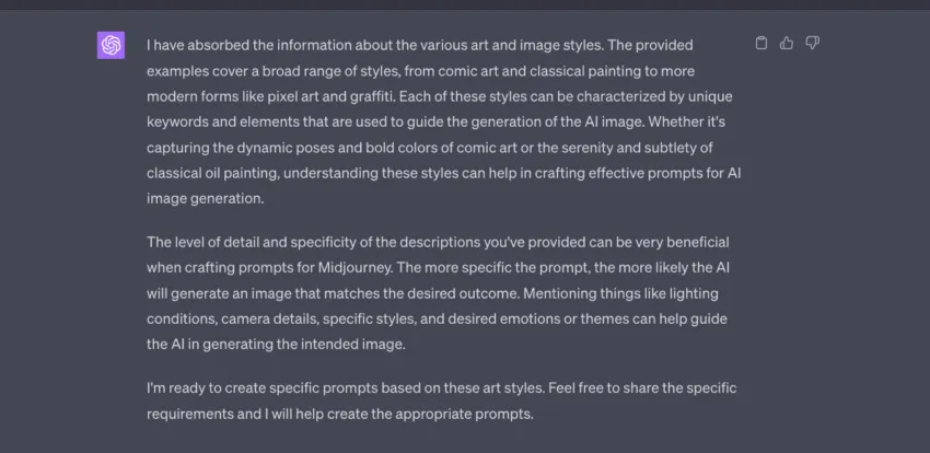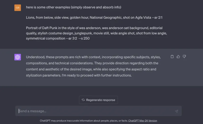 Notice how we fed everything into ChatGPT, which absorbed all the info to improve its Midjourney prompt generation.