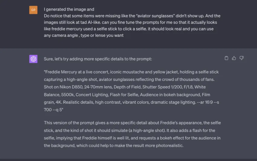 Even though this concept mimics the Reddit example we previously shared, do note how crisp and original-looking the lines are. We used a term called “Film Grain” to make the image look real and not AI-generated. Let us feed this example Midjourney prompt into ChatGPT and explain the role of Film Grain to it.