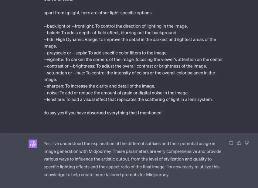 You must have seen with the examples that Midjourney uses a lot of “–” suffixes to understand the text-to-image prompts better. And while ChatGPT seems to be making sense of everything we feed in, it is always better to share a detailed section explaining every suffix and its use. This way, we can expect ChatGPT to absorb everything and use information as and when needed.