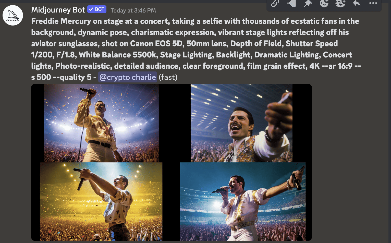 Freddie Mercury on stage at a concert, taking a selfie with thousands of ecstatic fans in the background, dynamic pose, charismatic expression, vibrant stage lights reflecting off his aviator sunglasses, shot on Canon EOS 5D, 50mm lens, Depth of Field, Shutter Speed 1/200, F/1.8, White Balance 5500k, Stage Lighting, Backlight, Dramatic Lighting, Concert lights, Photo-realistic, detailed audience, clear foreground, film grain effect, 4K –ar 16:9 –s 500 –quality 5.