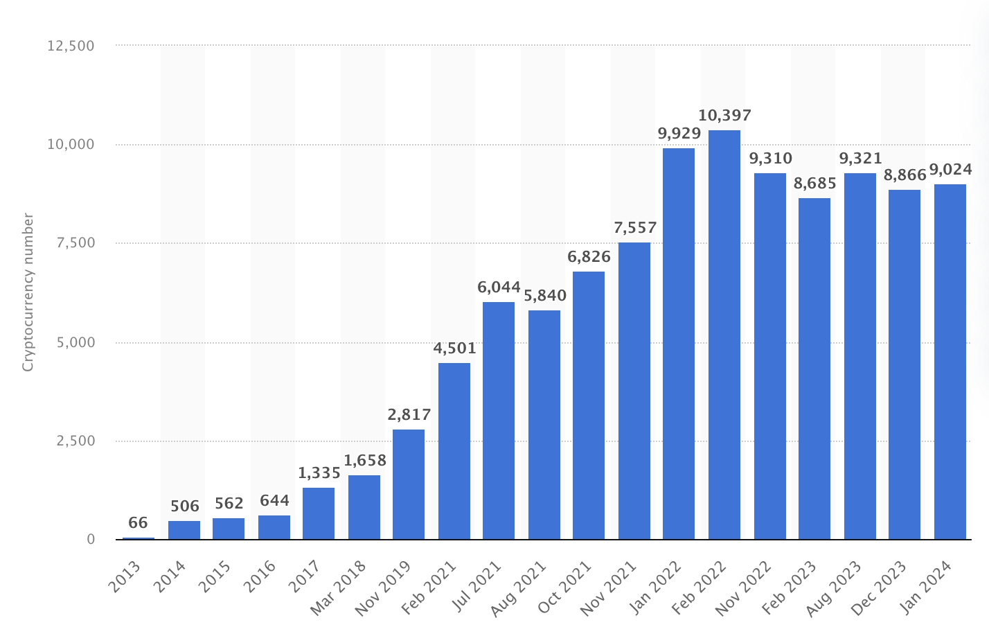 The crypto space doesn’t lack new tokens. According to the research chart below from Statista, there were over 9,000 crypto coins in circulation as of January 2024. The number tends to increase every year, especially during bear markets, as was the case in 2022.