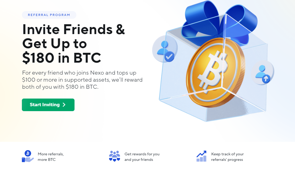 When you sign up for Nexo, you will have the opportunity to refer friends to earn rewards. You and a friend can earn $25 in Bitcoin when you refer someone and they deposit at least $100. Once your referral is verified, you will receive payouts within 30 days.