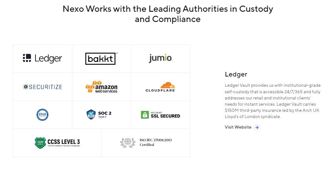 Nexo uses a network of custody and insurance providers, like Ledger Vault and Bakkt, which offer protection through premier underwriters such as Lloyd’s of London. Ledger Vault facilitates 24/7 institutional-grade self-custody with $150M insurance.