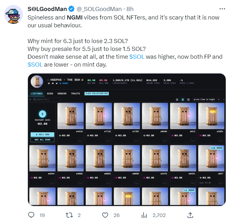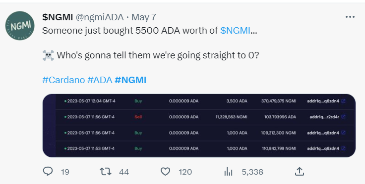 One can also extend the NGMI label to crypto community members themselves. For instance, NFT holders who price their NFTs below the floor price or constantly flip NFTs without considering losses and profits often get the NGMI tag.