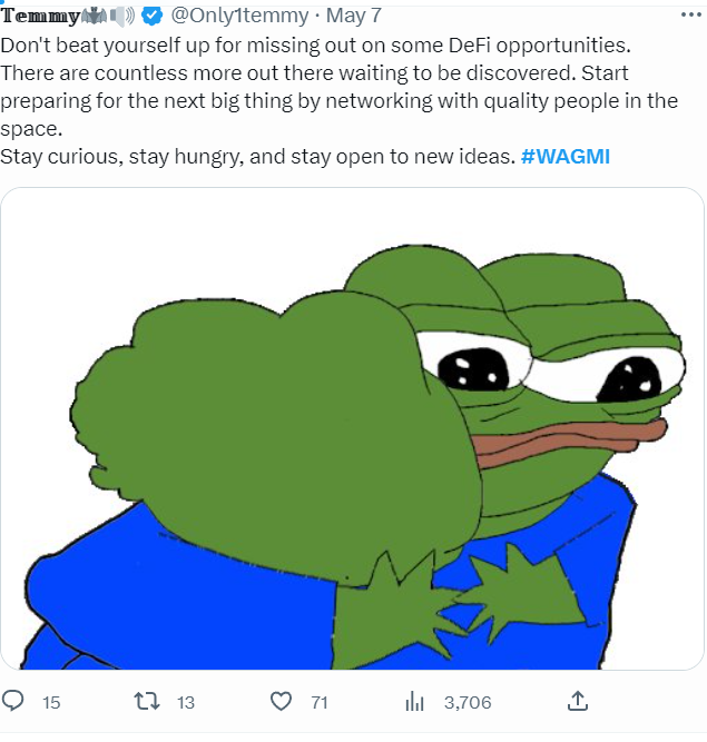 WAGMI is a battle cry among crypto enthusiasts to remind each other that, by working together, we can achieve great things. And even if times are hard right now, they will get better.