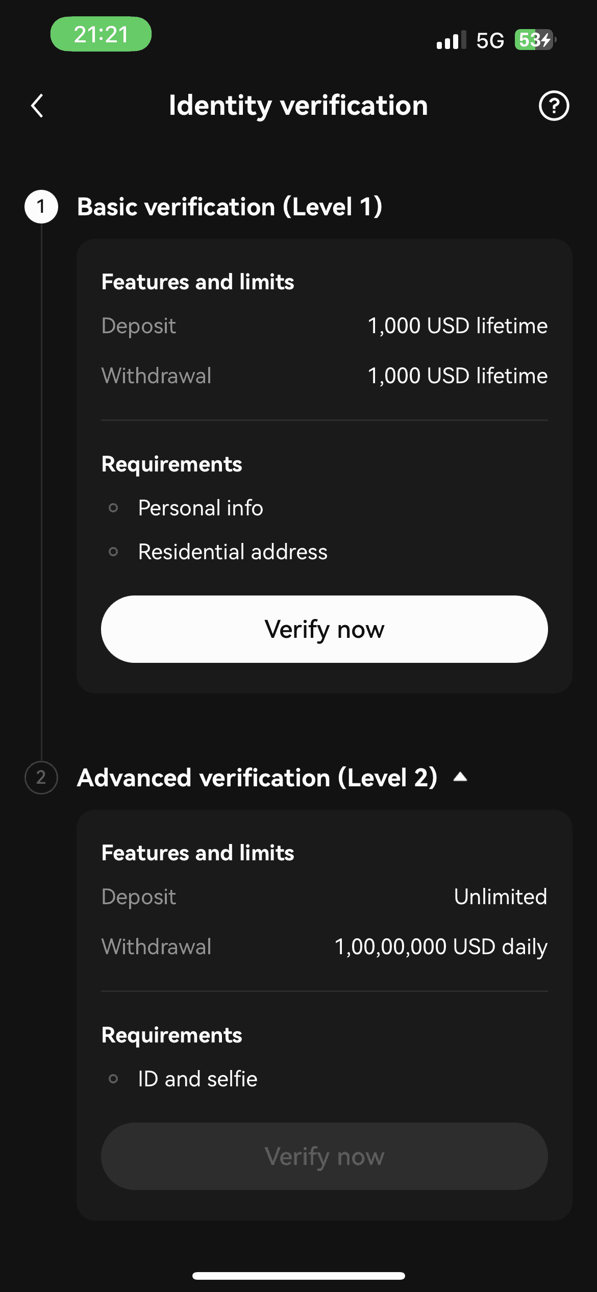 For instance, basic verification — simply providing the ID — lets you deposit and withdraw 1000 USD over the trading lifetime. However, if you verify your identity with documentation and selfies, you can unlock unlimited deposits and a daily withdrawal limit of 10,000,000 USD.