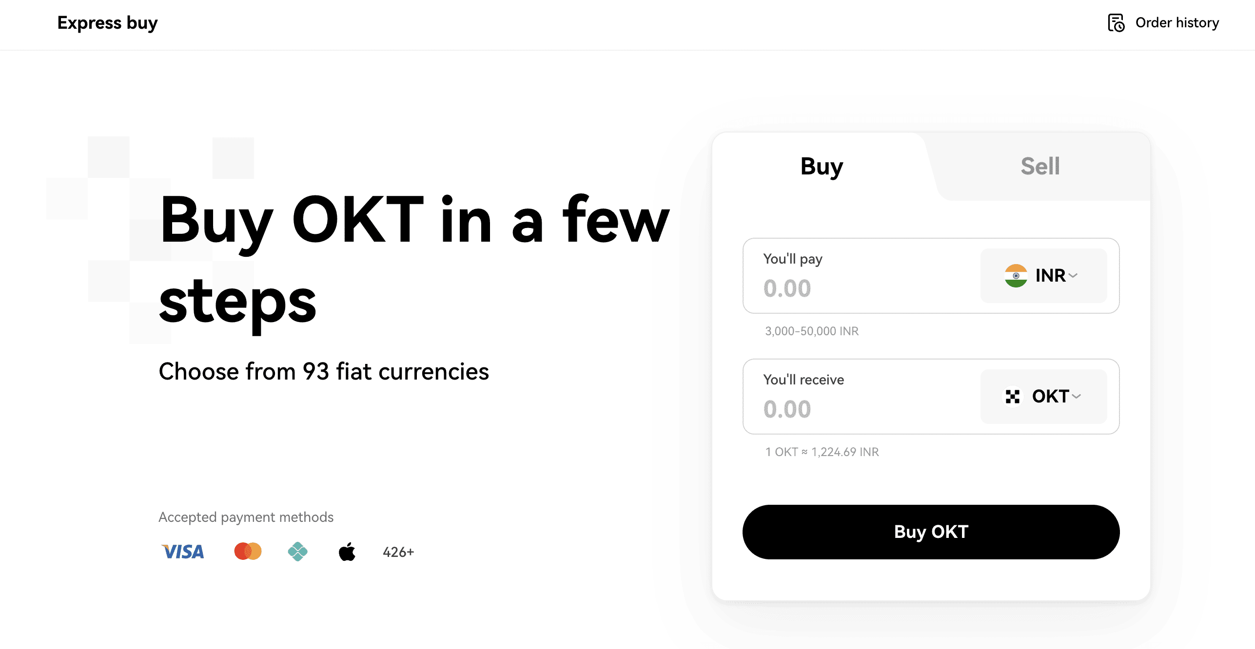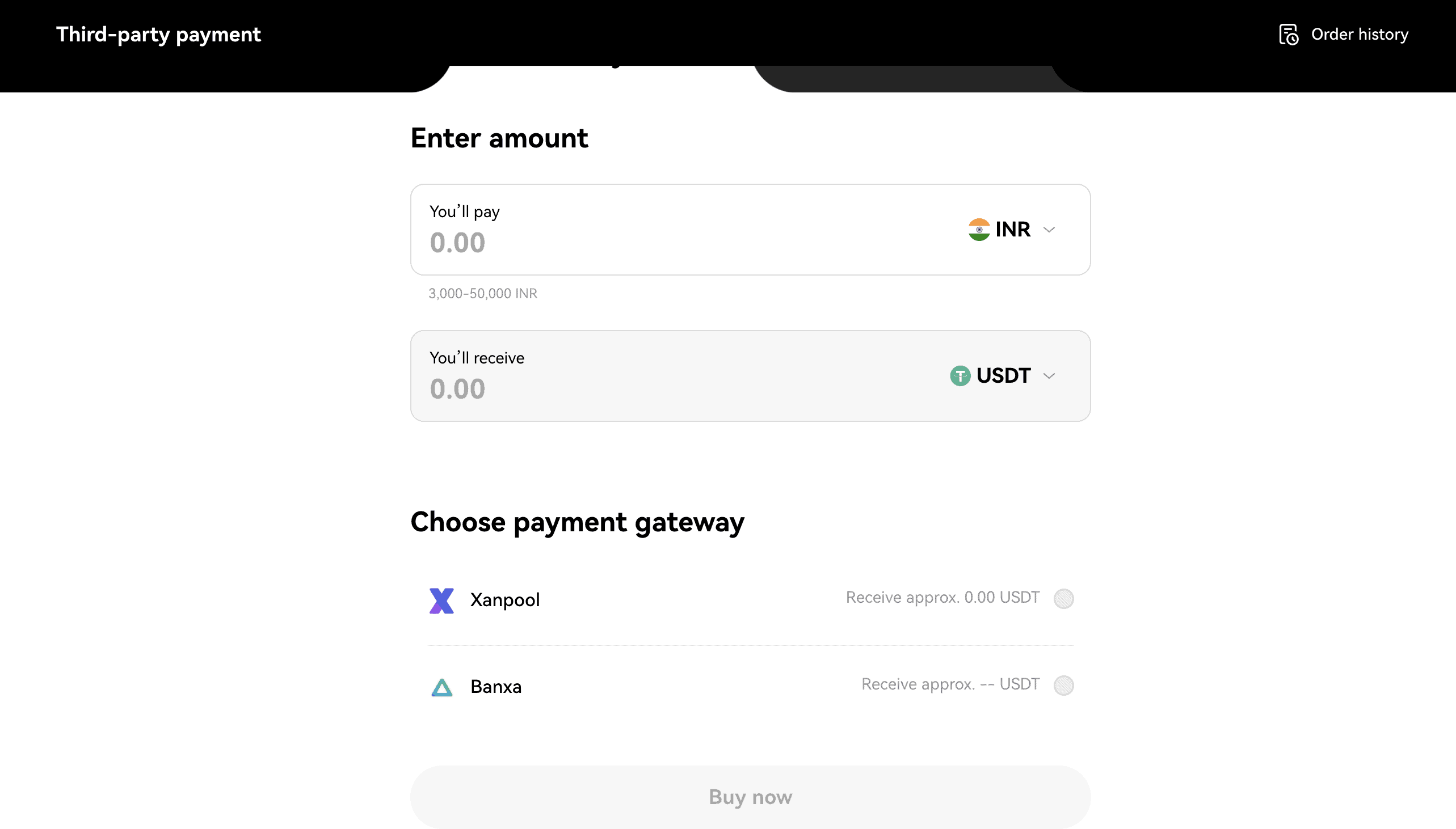 Under the “Express Buy” section, you can choose from 93 fiat currencies, with over 420 payment methods accepted. An exclusive “third-party payment” method allows you to purchase through third-party service providers like Banxa, Xanpool, and more.