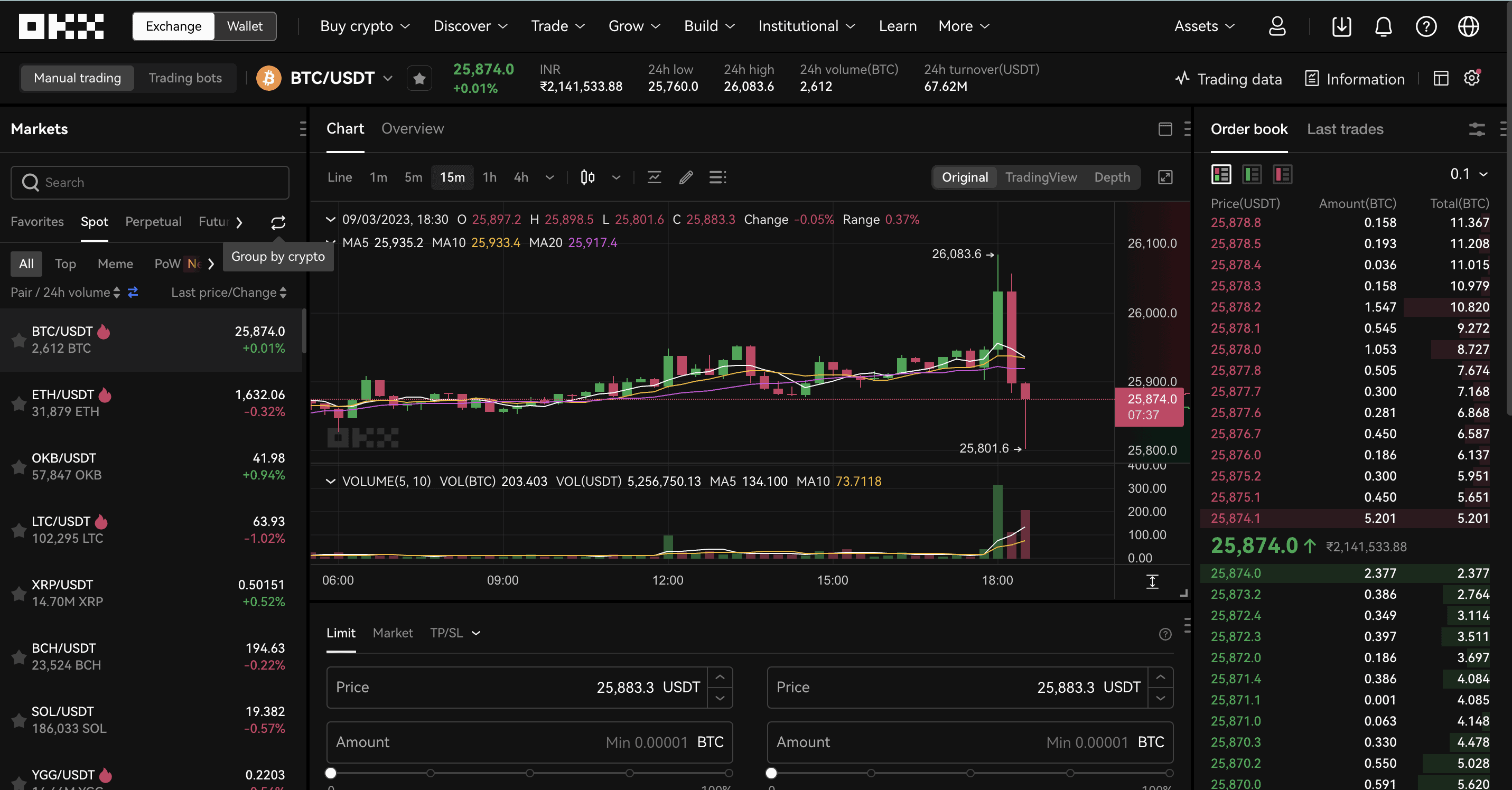 OKX brings forth an intuitive trading interface, allowing you to look at the charts, place market or limit orders, check the order book and market depth, and even juggle between spot, perps, futures trading, and other crypto-specific functions.