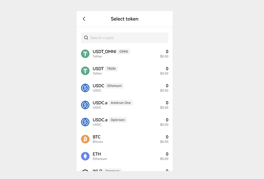 To send crypto to your OKX wallet, search for the crypto you want to deposit and click on it to reveal the deposit address.