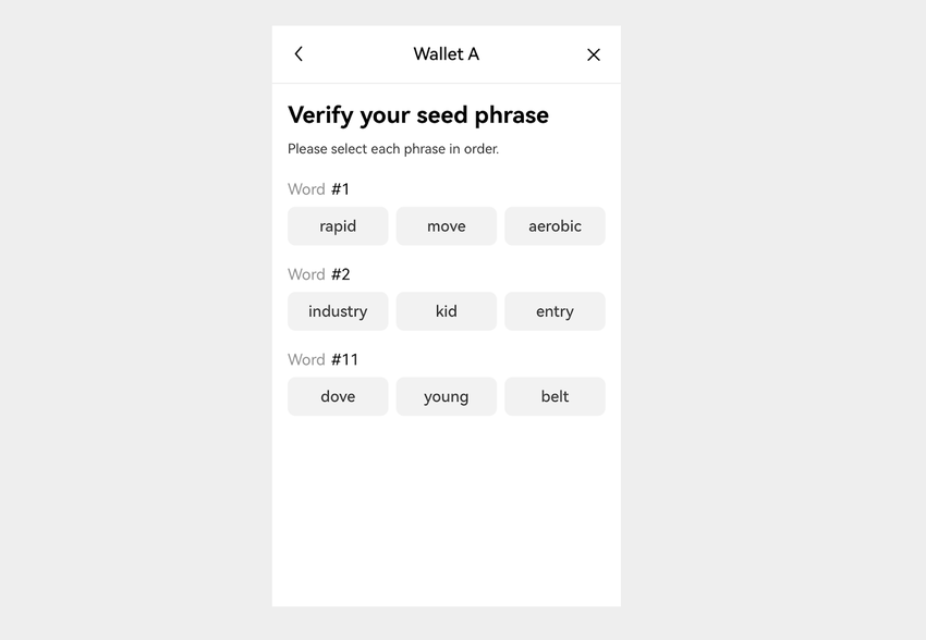 After you have safely stored your seed phrase, the wallet will need to confirm it. It will ask for some of the words in the correct order.