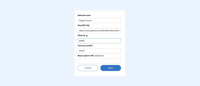 Now we can integrate this endpoint into the MetaMask wallet (“Settings” — “Add new network”). We need to paste the address of our endpoint to the New RPC URL field and set 80001 as the ID of Polygon testnet Mumbai.